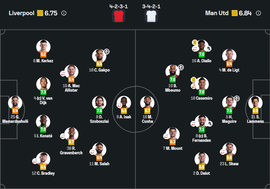 Ламменс – Шоу (Йоро 85′), Де Лигт, Магуайр – Диалло (Доргу 59′), Каземиро (Угарте 58′), Б. Фернандеш (Майну 85′), Далот – Мбемо, Маунт (Шешко 61′) – Кунья