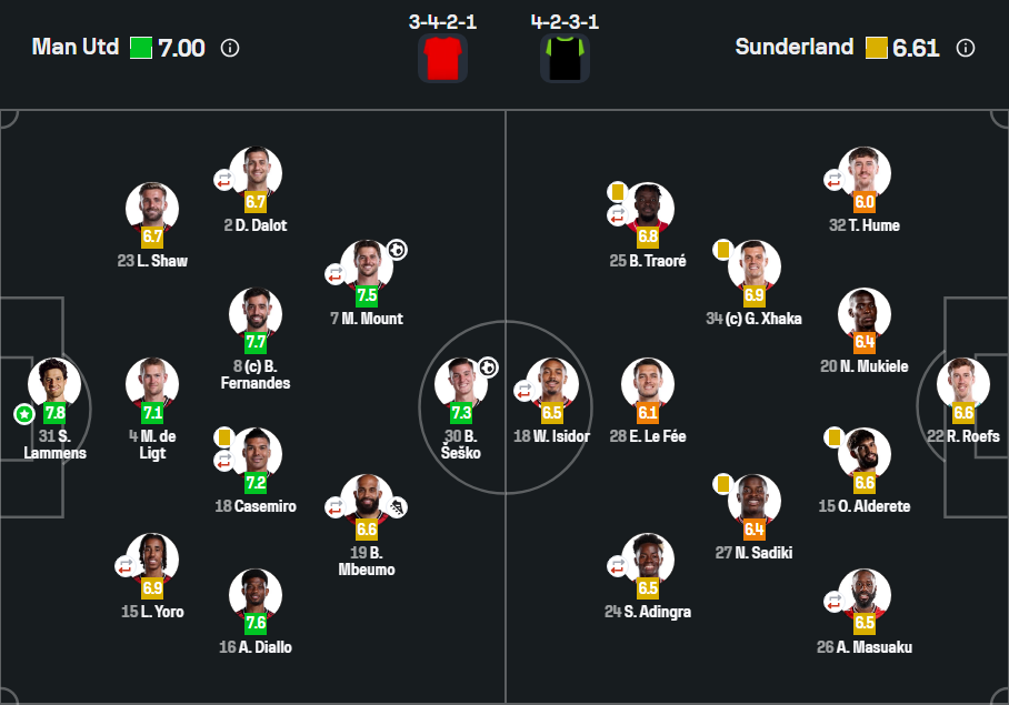 Ламменс – Шоу, Де Лигт, Йоро (Магуайр 85′) – Диалло, Каземиро (Угарте 85′), Б. Фернандеш, Далот (Доргу 64′) – Мбемо (Майну 77′), Маунт (Кунья 65′) – Шешко